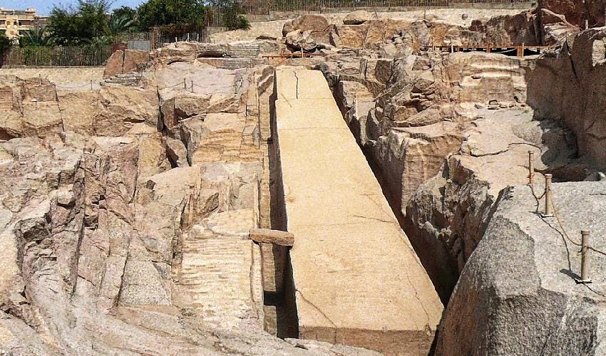 The Unfinished Obelisk of Aswan: Abandoned in its quarry, it presents clean, straight, and deep cuts that, according to experts, could only be achieved with tools equipped with diamond inserts, given the hardness of the granite and the quality of the finish.
