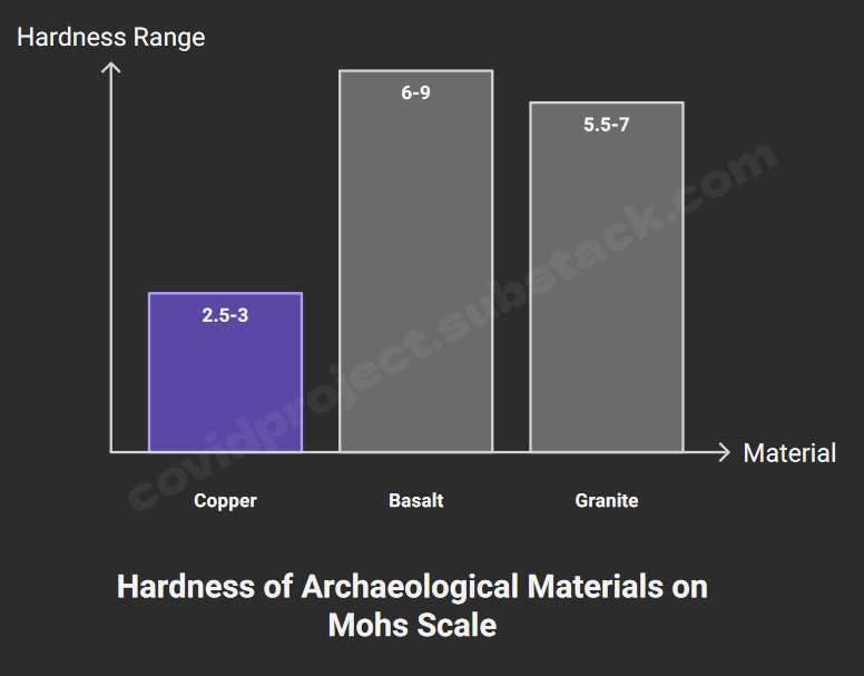 Basalt presents a hardness factor of between 6 and 9 on the Mohs scale, and granite usually falls between 5.5 and 7. In contrast, copper has a hardness of only 2.5 to 3.5. Attempting to carve granite with copper is physically impossible; this attempt has been compared to trying to “cut a marble table with scissors.” It is physically impossible to carve basalt or granite with copper chisels and stone hammers with the millimetric precision we observe in Giza. The tools would disintegrate before making a significant dent. Not even the use of quartz sand as an abrasive explains the efficiency needed to process millions of blocks, as the tool wear would be massive and there are no traces of the immense foundries required to recycle the millions of chisels that would have been destroyed in the process.